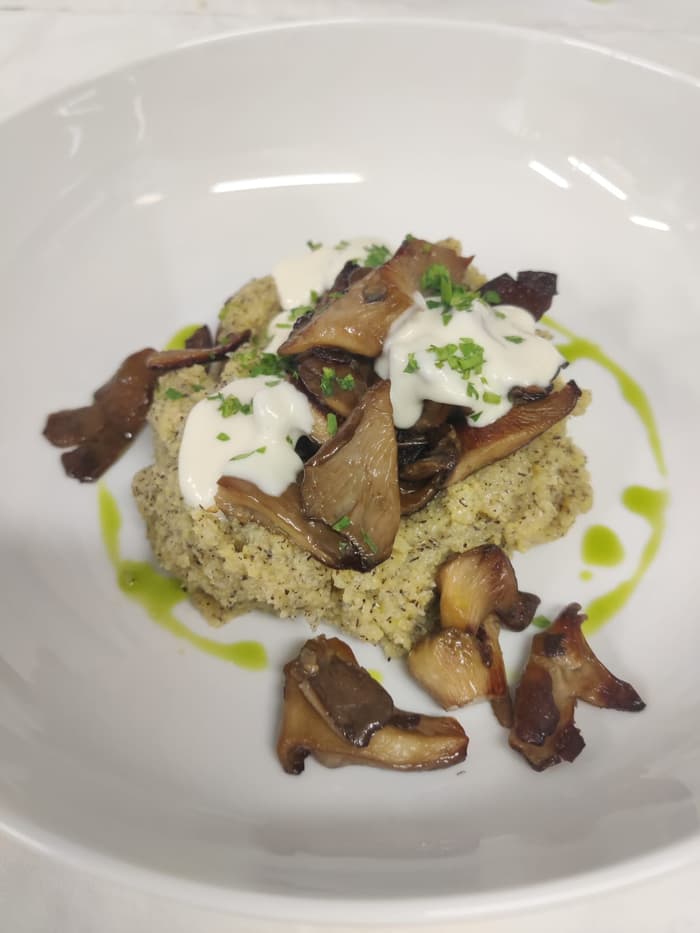 Polenta di farina taragna nostrana, funghi pleurotus arrostiti al prezzemolo, crema di formaggio erborinato delle valli orobiche