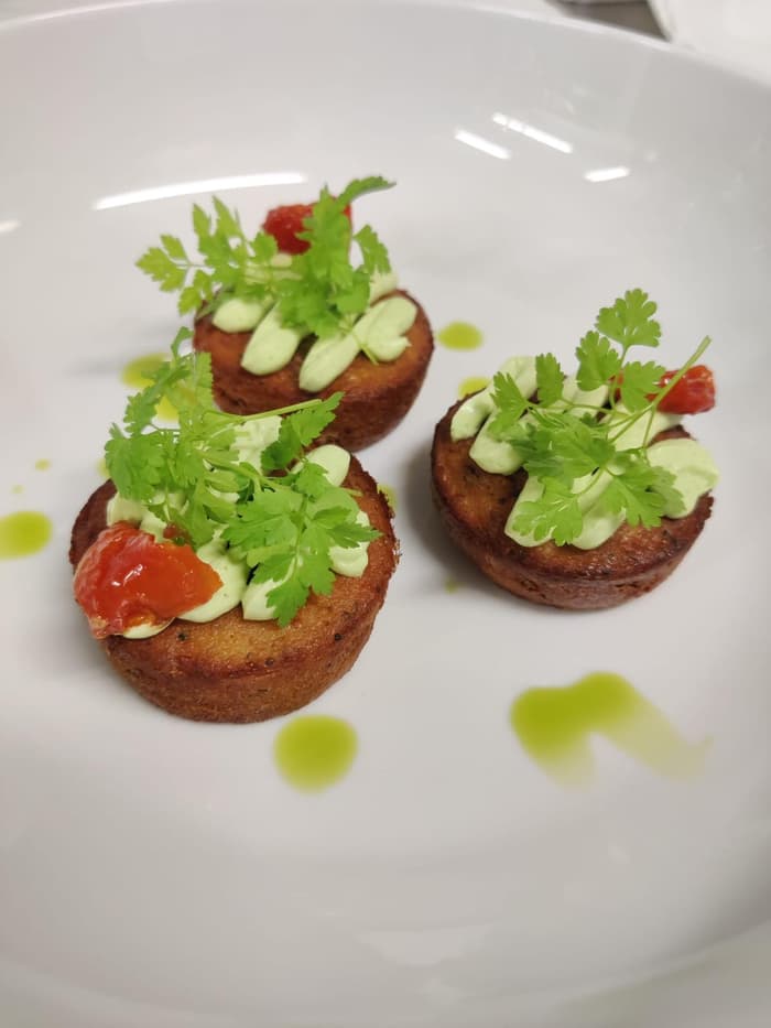 Pacchero fritto ripieno di melanzane al forno su crema al basilico e pomodorini confit